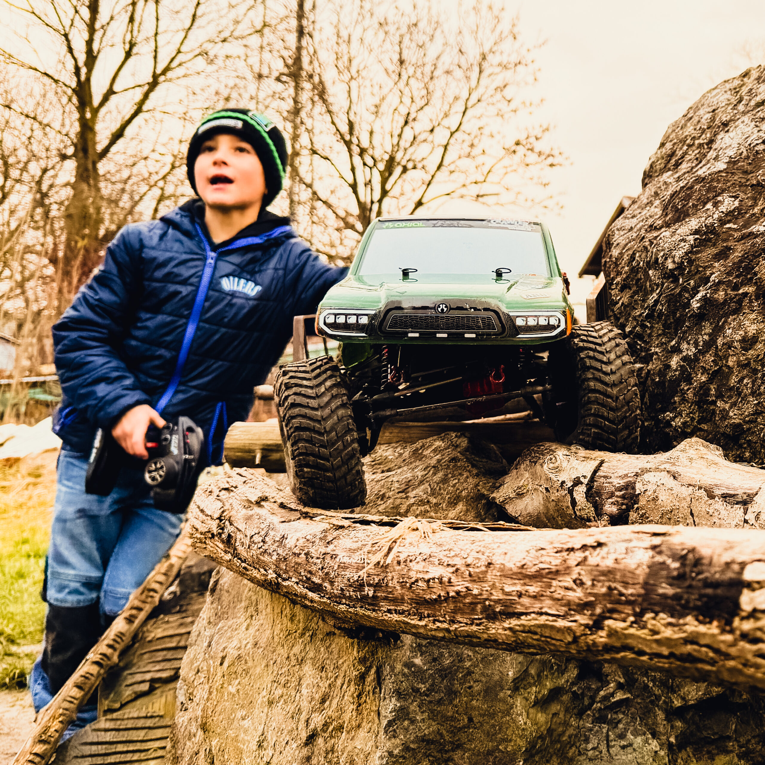Und eine wetterfeste Runde 1:10er Crawler nutze spontan ein paar Stunden Wintersonne, die es heuer leider nur selten gab, um das Trial Gelände zu erkunden.